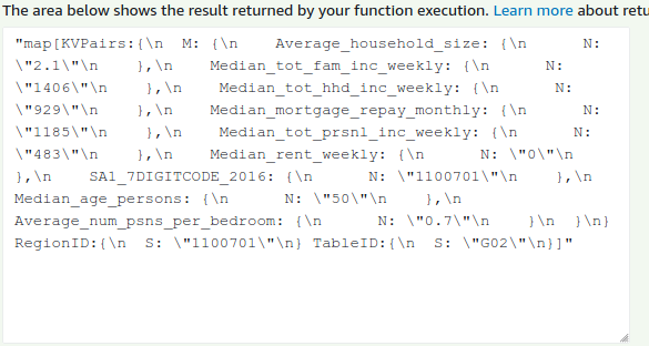 All the geographies from AUS–> SA2 are loaded for my above-selected topics. About 788MB of JSON in the end, totalling 333186 items in DynamoDB. It took about ~20 minutes to load it all up over my bad internet.